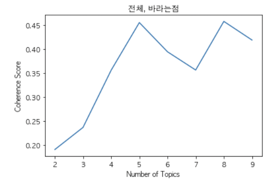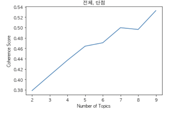Number of Topics가 9일 때, Coherence Score가 높은 것을 확인할 수 있습니다.