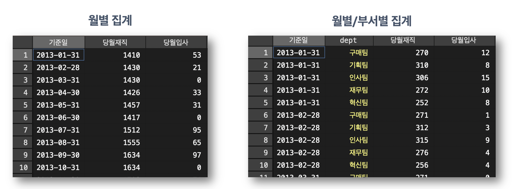팀장 "BCD 대리~ 오늘 오전까지 최근 n년간 부서별 입사자/재직자/퇴직자 수 변화를 월별로 보고해줘요."