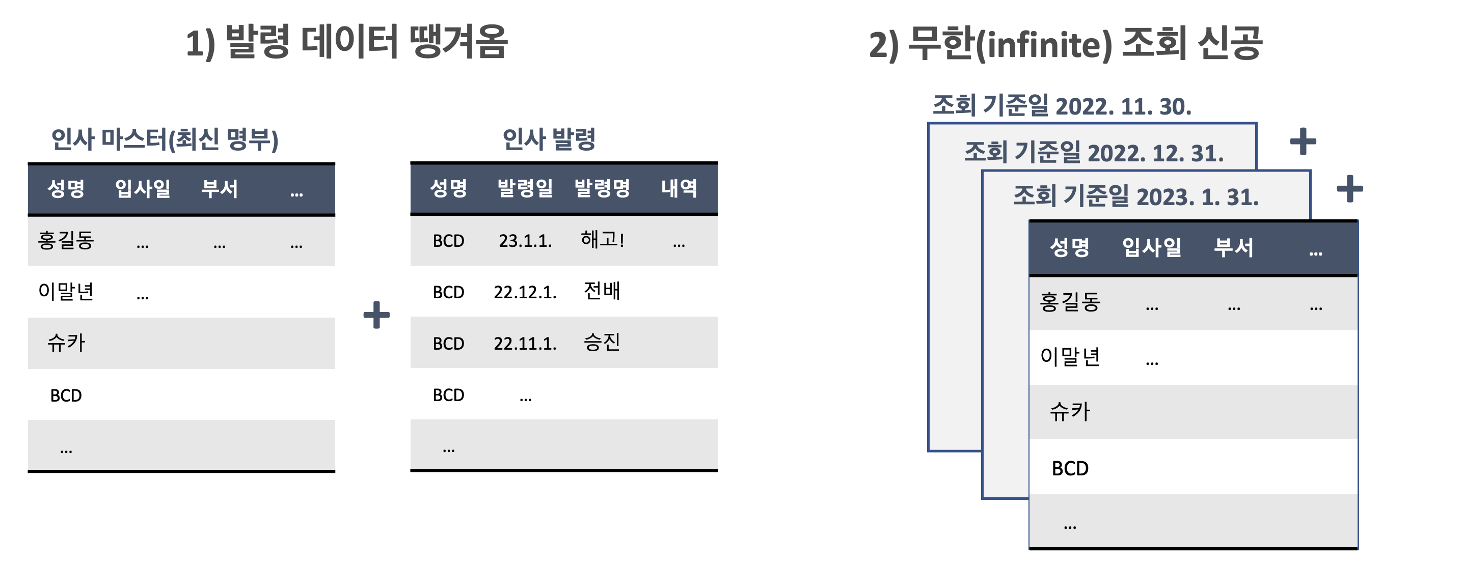 처음에 방법은 한가지라고 한 이유는 이 때문이다. 정말 많은 데이터를 다룰 때는 두번째 방법이 의미가 없다. 실제로 모든 데이터는 "기준정보", "발령", "마스터 정보" 등으로 구성되기 때문에, 시스템적으로 볼 때 첫번째 방법을 사용하면 모든 조회일별 명부를 만들 수 있고 두번째방법이 필요없다.
