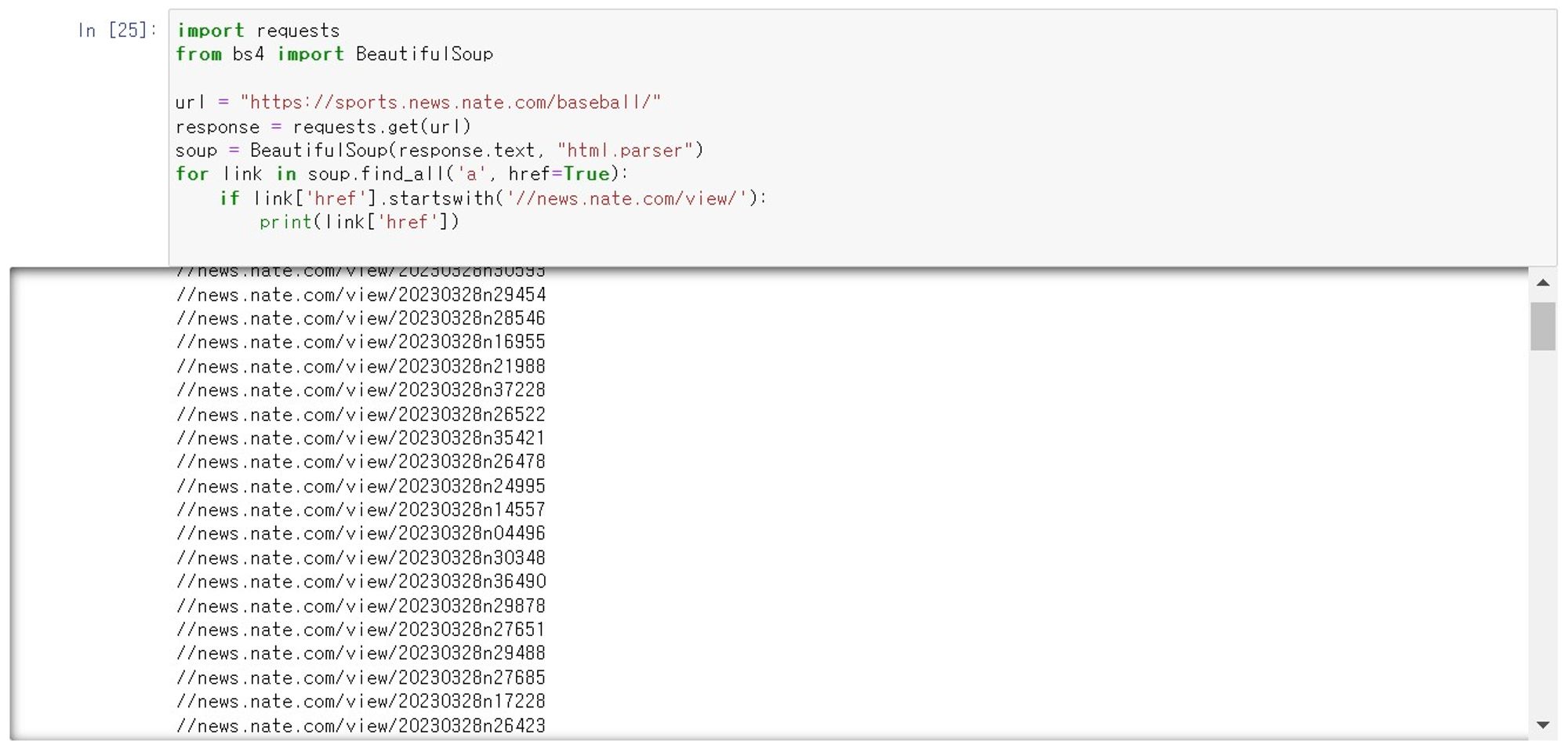 • 그랬더니 놀랍게도, 드디어! 결과물(URL 크롤링)이 출력됨
