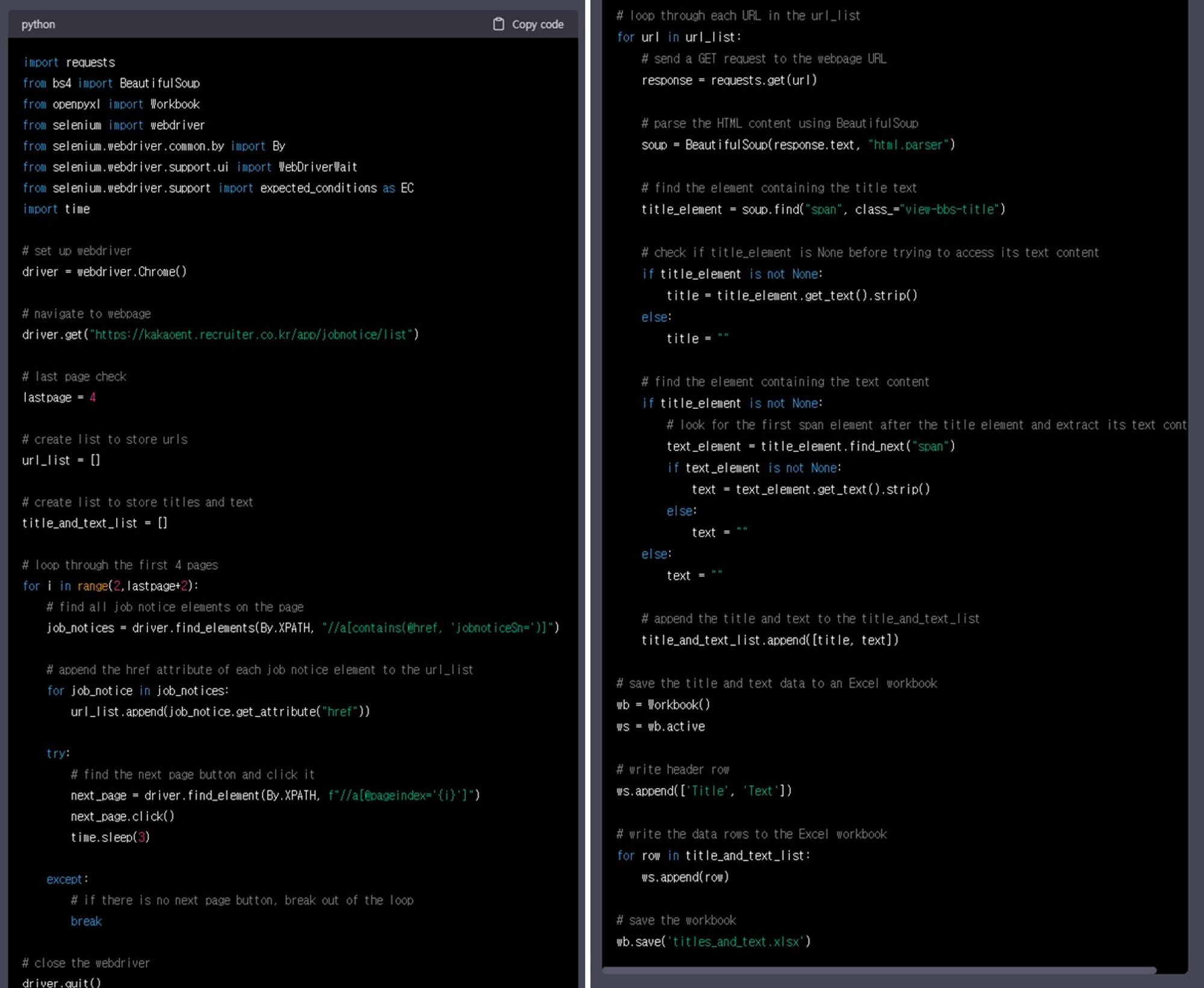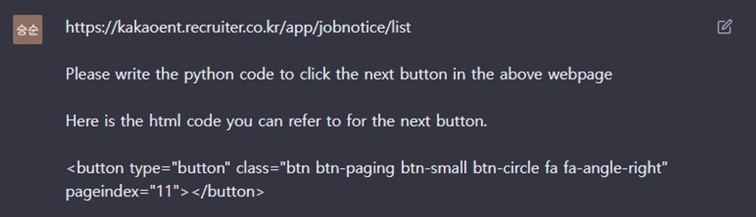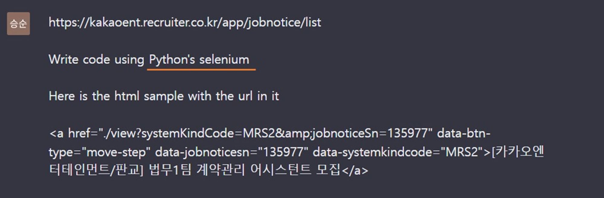 • 영입사이트가 동적인 페이지인지는 모르겠으나, selenium 라이브러리를 활용하여 코드를 써달라고 chatGPT에게 부탁함