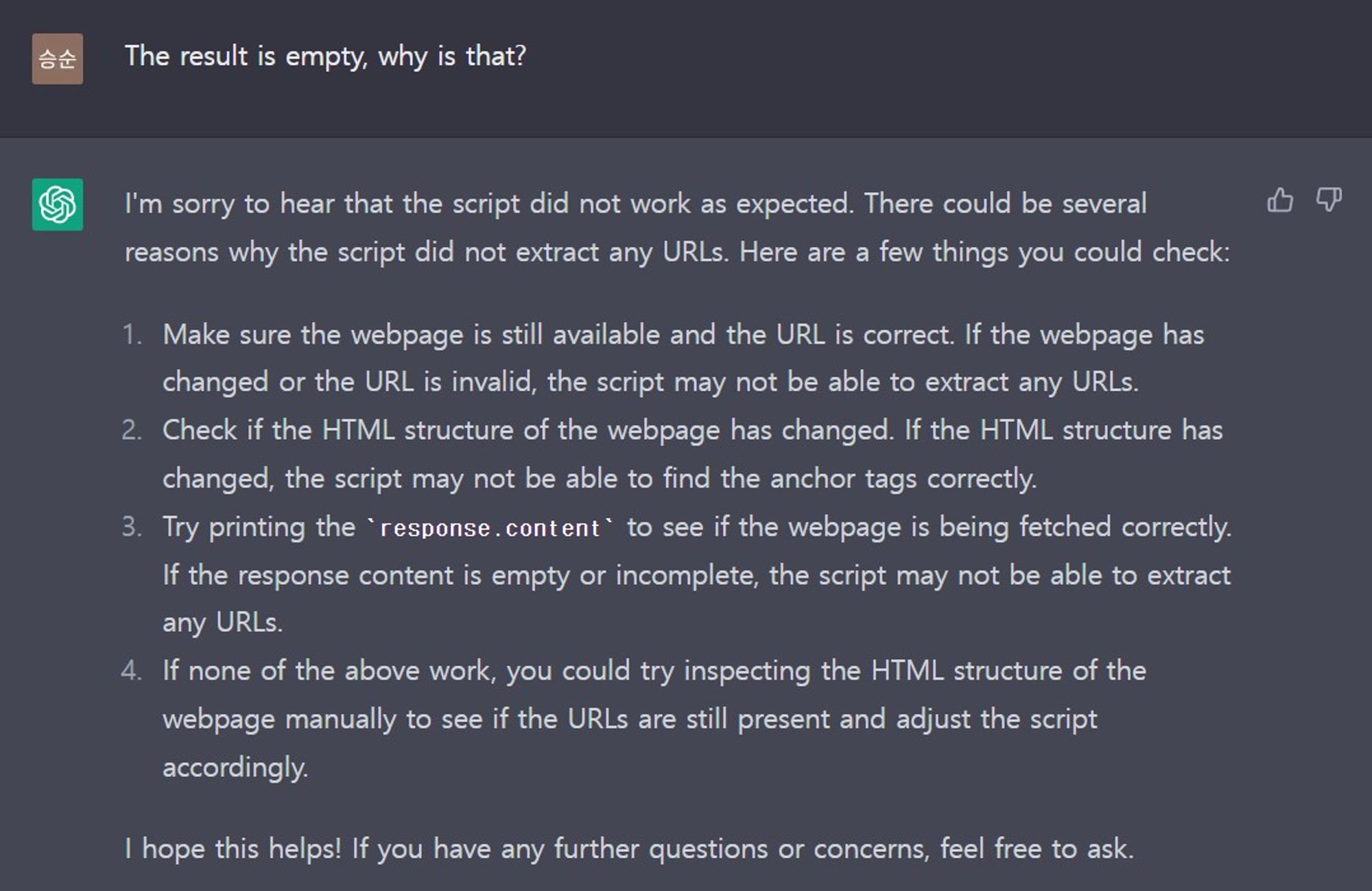• 앞서와 마찬가지로 chatGPT에게 해당 페이지의 URL과 html 샘플을 보여주고 코드를 부탁함
