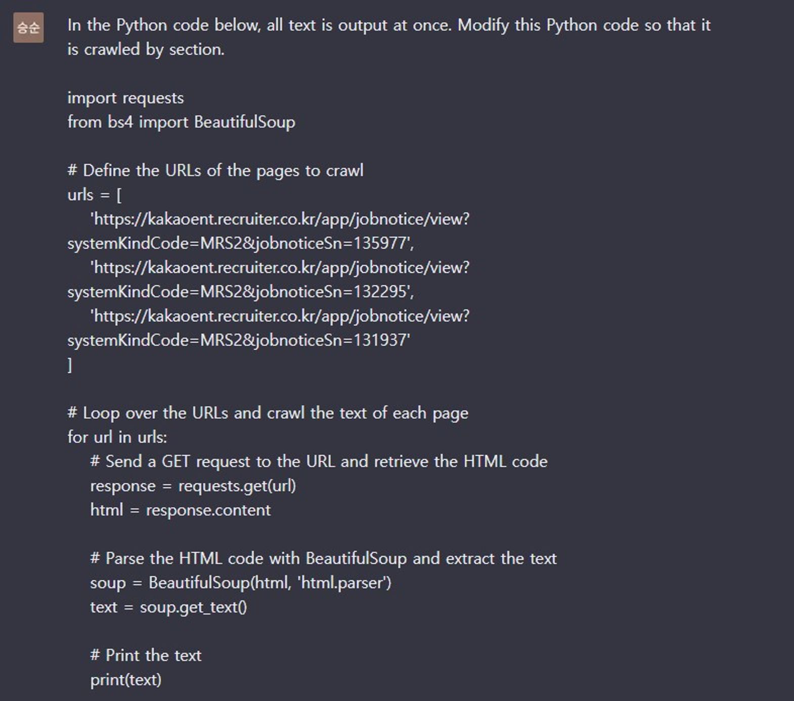 • 코린이지만 요즘엔 chatGPT가 코드도 써준다길래, chatGPT를 통해서 기존 영입페이지의 텍스트를 크롤링할 수 있는 코드를 작성해보기로 함.