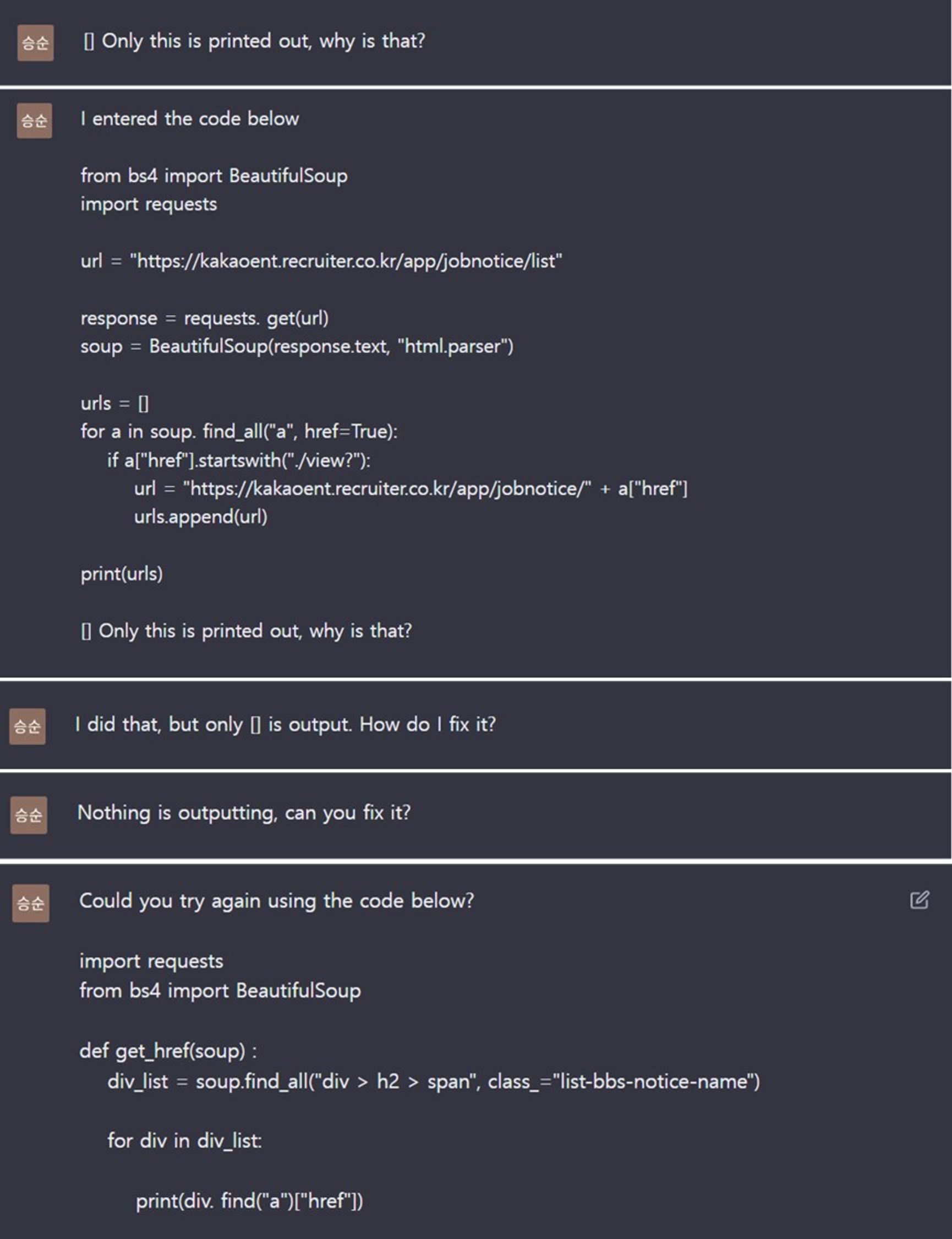 • 적절한 코드가 나올 때까지 ‘질문을 바꿔가며’ 계속 다시 써달라고 부탁했지만 [ ]만 출력됨