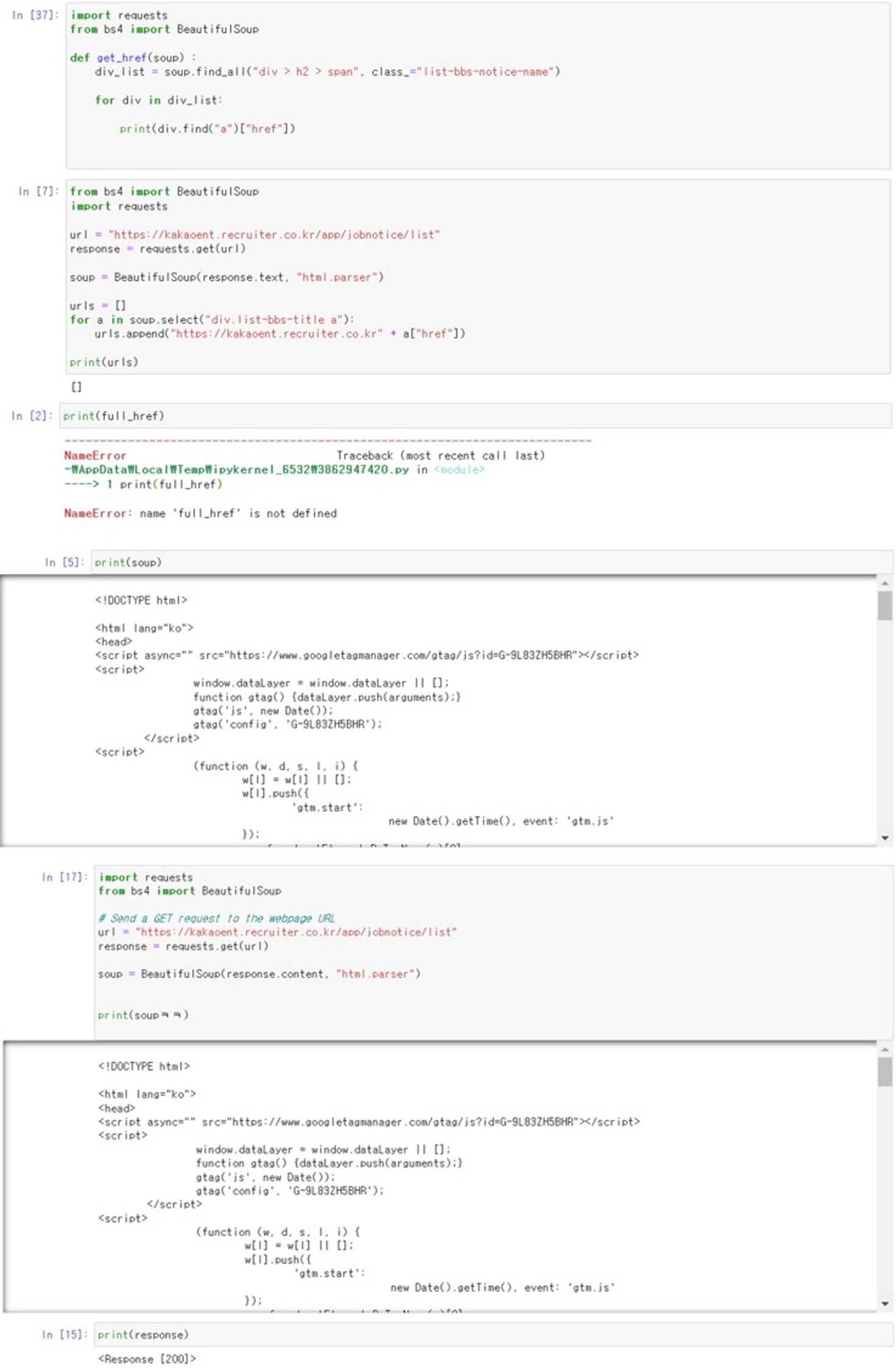 아마 이렇게 코드를 짰을 것이다 import requests from bs4 import BeautifulSoup # HTTP GET Request req = requests.get('링크') # HTML 소스 가져오기 html = req.text # BeautifulSoup으로 html소스를 python객체로 변환하기 soup = Bea
