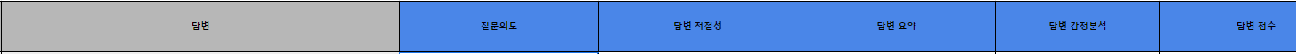 | 질문의도 | 답변적절성 | 답변 요약 | 답변 감정분석 | 답변 점수 |
