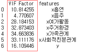 : 독립변수(x) 별 VIF 측정 결과 대부분의 변수에 다중공선성이 존재함을 확인