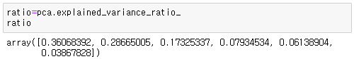 ⇒ PC1, PC2, PC3 의 설명력 합은 약 80%(0.35+0.28+0.17=0.8)이므로