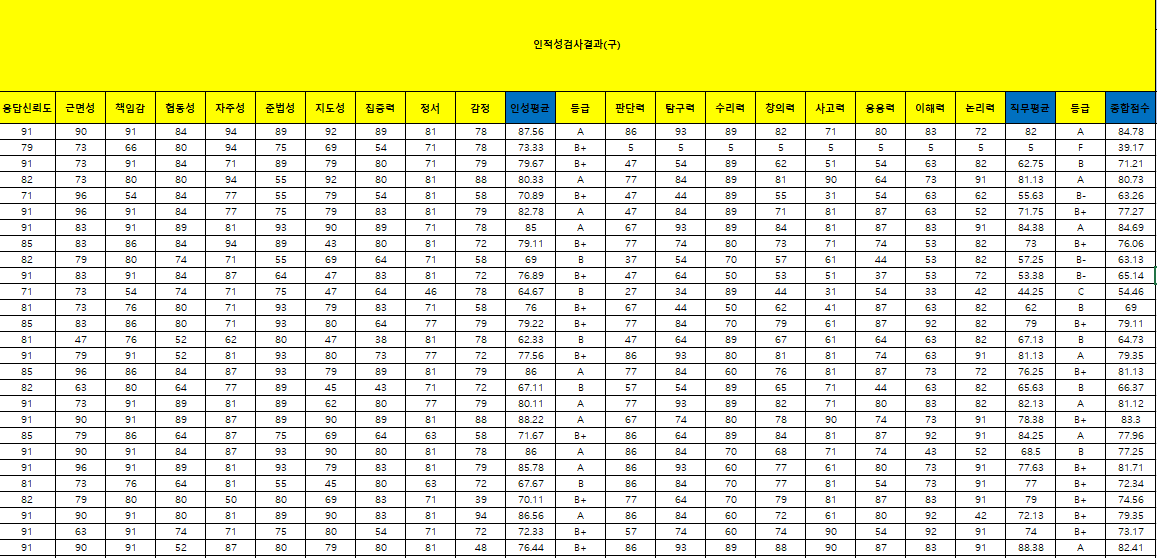 | 독립 | (구)인적성결과: 인성평균, 직무평균, 종합평균 |