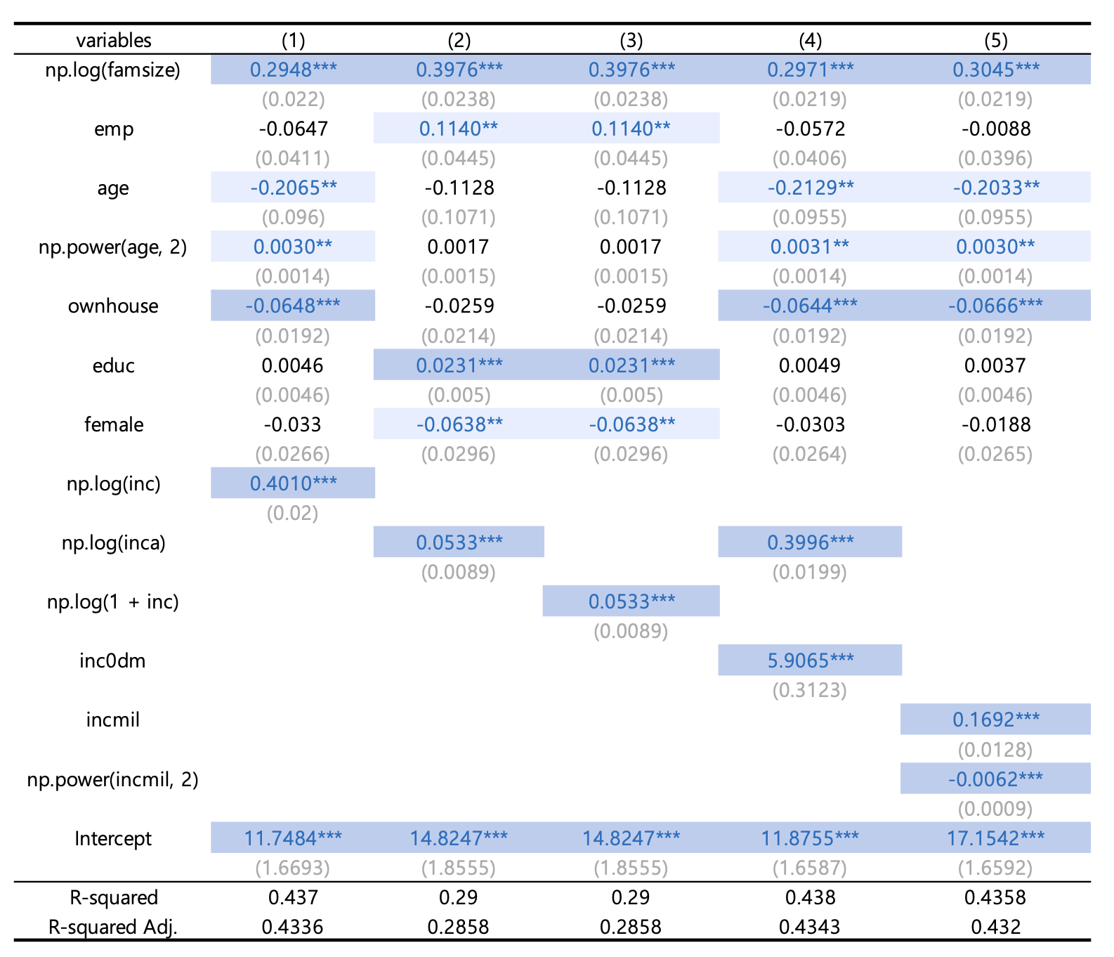 fm = 'np.log(cons)~np.log(famsize)+emp+age+np.power(age, 2)+ownhouse+female+educ'
