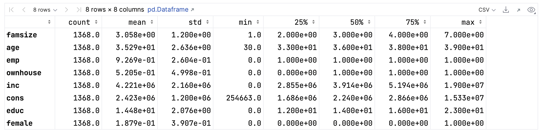 hies = hies[['famsize', 'age', 'emp', 'ownhouse', 'inc', 'cons', 'educ', 'female']]