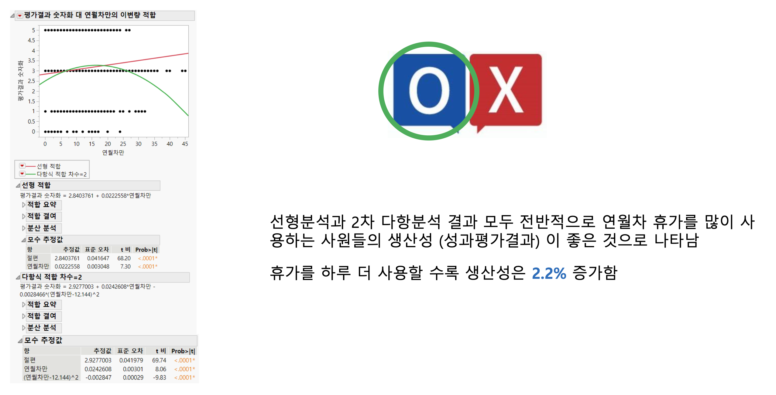 가설 2 휴가 사용을 많이 하는 사원들은 생산성이 높을 것이다 (통계적으로 유의미 하다, 상관관계가 있다)