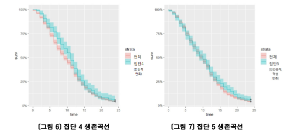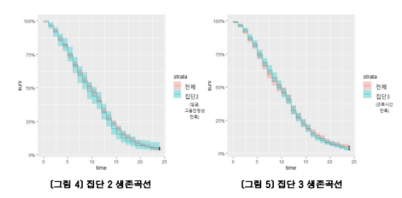 연구에서는 대졸청년층의 첫 일자리에서의 조기이직발생시점을 첫 일자리적응유형에 따라 확인하기 위해 카플란마이어생존곡선을 사용했다. 전체대상자의 생존곡선은 입사 이후 5개월까지 위험률이 증가하다가 12개월에서 최고점을 찍고이 후에는 감소하며 안정화되는 양상을 보였다. 집단 별로는 각각 조금씩 다른 특성을 보였는데, 그림 3은 '전반적 불만족'인 집단에서 조기이직 생존곡선을 나타낸다. 초기 6개월 동안 급격한 조기가 직감소를 보이며 24개월 동안 계속해서 높은 조기이직확률을 유지한다. 그림 4는 '임금, 고용안정성만족'인 집단을 나타내며, 초기 12개월은 전반적인 대상과 유사한 생존율을 보이나 이후에는 낮은 조기이직생존율을 나타낸다. 그림 5는 '근로시간만족'인집단으로, 15개월까지는 높은 조기이직 생존율을 보이나 이후에는 낮아지는 양상을 보여준다. 그림 6은 '전반적 만족'인 집단으로 전체 대상과 비교해 높은 조기이직 생존율을 24개월 동안 유지한다. 마지막으로, 그림 7은 '인간관계, 적성만족'인 집단을 나타내며, 초기 6개월 동안은 낮은 조기이직 생존율을 보이지만 그 이후에는 높아지는 경향을 나타낸다.