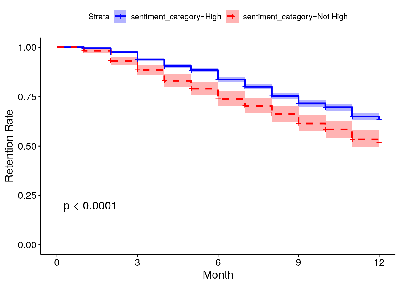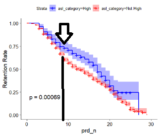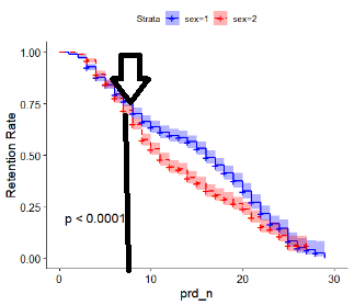 Kaplan-Meier 생존 함수를 사용하면 집단 간 생존함수 차이 검증이 가능하다. 차이 검증에는 로그-랭크 테스트 (Log-Rank Test)가 주로 활용되는데, 두 개 이상의 생존 곡선이 통계적으로 유의미한 차이가 있는지 검정하는 방법 중 하나이다. 이러한 검증을 통해, 관심 집단 간의 생존함수 차이를 검증할 수 있다. 예를 들어 직군별 퇴직률 차이검증을 통해 가장 높은 퇴직률을 보이는 직군에 집중된 인력 유지 계획을 세울 수 있게 도와준다.