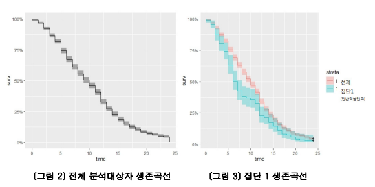 - Kaplan-Meier 생존 함수 : 생존 곡선을 시각적으로 비교하여 집단 간의 생존 확률 차이를 확인