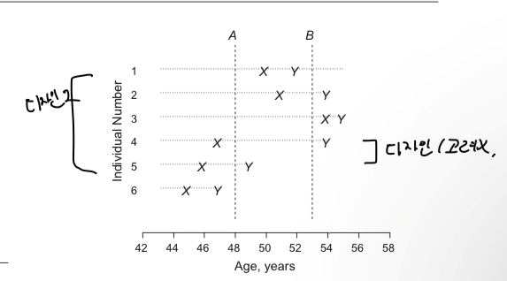 - 10년 동안의 연구진입 시 나이 범위를 설정(예: 40~50세).
