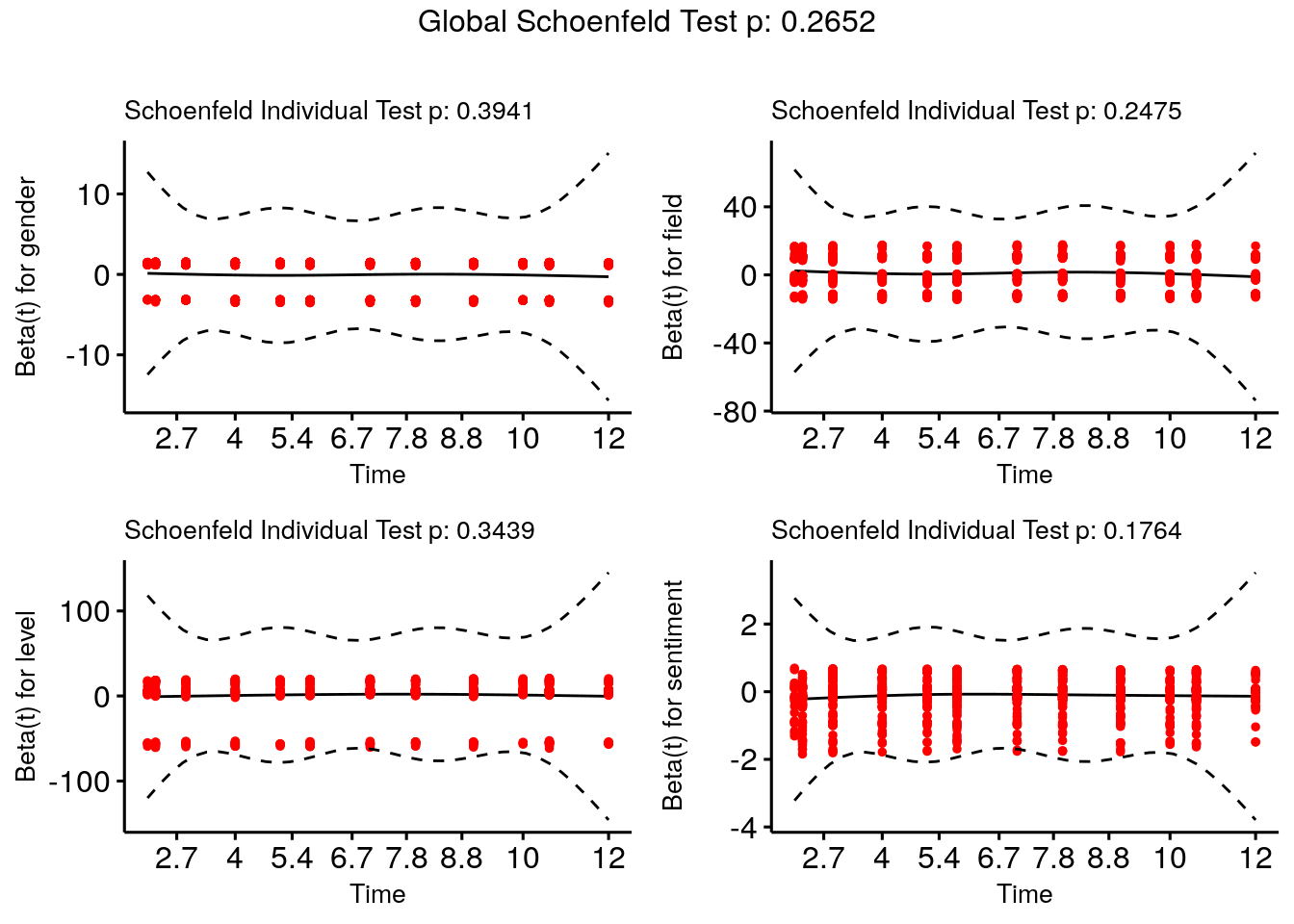 이와 같은 Cox 모형은 비례위험 가정을 기반으로 하는데, 비례위험 가정이란 각 변수의 위험비율이 시간에 따라 일정하다는 것을 의미한다. 즉, 모든 시점에서 변수들의 영향이 고정되어 있다고 가정하는 것이다. 만약 비례위험 가정이 깨진다면, 즉 위험 비율이 시간에 따라 변한다면, Cox 모델이 해당 표본에 적절하지 않다는 것을 의미한다. 따라서 Cox모델의 유효성을 평가할 때는 비례위험 가정이 충족되는지 확인하는 것이 중요하다.