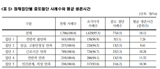 이 연구에서는 대졸 청년층의 첫 일자리에서의 적응 유형을 '전반적 불만족', '임금, 고용 안정성 만족', '근로시간 만족', '전반적 만족', '인간관계, 적성 만족' 등 5가지 잠재 집단으로 도출하였다. 또한 연구에서는 대졸 청년층의 첫 일자리 적응 유형에 따라 조기이직 시점의 차이를 살펴보기 위해 생존분석을 사용했다. 이 경우에는 첫 일자리에서의 조기이직 여부와 이직까지의 생존 기간이 주요 관심 대상이었다.