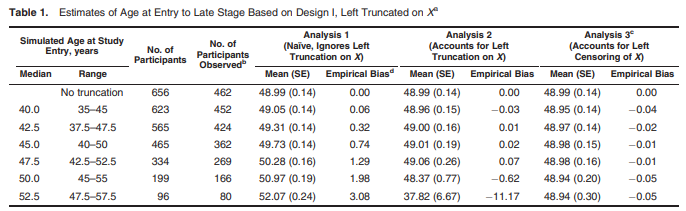 [2] Cain, K. C., Harlow, S. D., Little, R. J., Nan, B., Yosef, M., Taffe, J. R., & Elliott, M. R. (2010). Bias Due to Left Truncation and Left Censoring in Longitudinal Studies of Developmental and Disease Processes