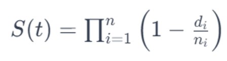 Kaplan-Meier 생존 함수는 시간에 따른 생존 확률을 추정하는 통계적 방법이다. 사건이 발생하는 시간을 고려하는 경우 유용한 방법이다. 특정 시점에서의 생존 확률은 그 시점까지 사건이 발생하지 않은 관측치의 비율로 계산한다. 수학적으로 살펴보면 다음과 같다.