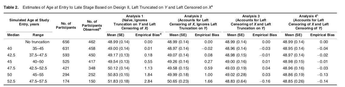 [2] Cain, K. C., Harlow, S. D., Little, R. J., Nan, B., Yosef, M., Taffe, J. R., & Elliott, M. R. (2010). Bias Due to Left Truncation and Left Censoring in Longitudinal Studies of Developmental and Disease Processes