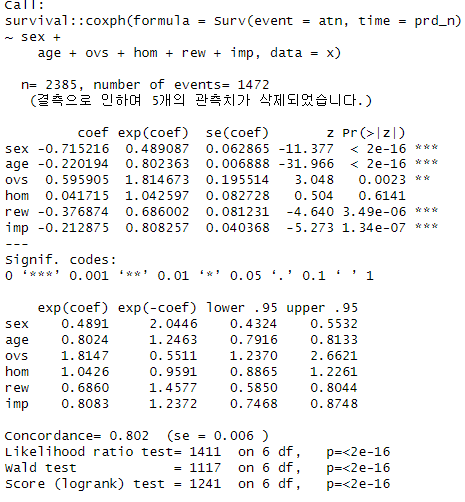 **: 세 가지 테스트(Likelihood ratio test, Wald test, Score (logrank) test) 모두 유의한 p-값(<2e-16)을 보여줍니다. 이는 모델이 데이터에 잘 적합하다는 것을 나타냅니다.