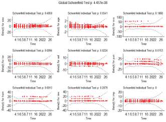 이와 같은 Cox 모형은 비례위험 가정을 기반으로 하는데, 비례위험 가정이란 각 변수의 위험비율이 시간에 따라 일정하다는 것을 의미한다. 즉, 모든 시점에서 변수들의 영향이 고정되어 있다고 가정하는 것이다. 만약 비례위험 가정이 깨진다면, 즉 위험 비율이 시간에 따라 변한다면, Cox 모델이 해당 표본에 적절하지 않다는 것을 의미한다. 따라서 Cox모델의 유효성을 평가할 때는 비례위험 가정이 충족되는지 확인하는 것이 중요하다.
