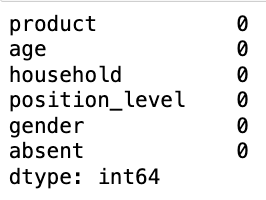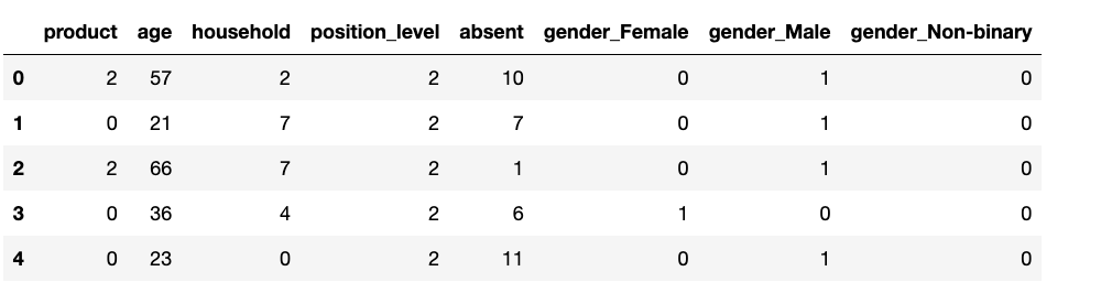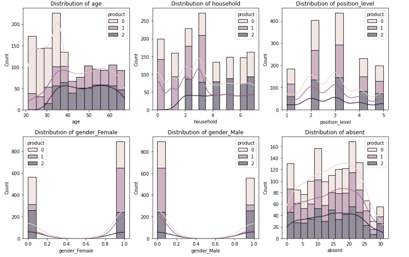 selected_columns = ['age', 'household', 'position_level', 'gender_Female', 'gender_Male', 'absent', 'product']
