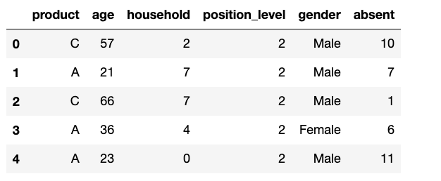 X = df[['age', 'household', 'position_level', 'gender_Female', 'gender_Male', 'absent']]