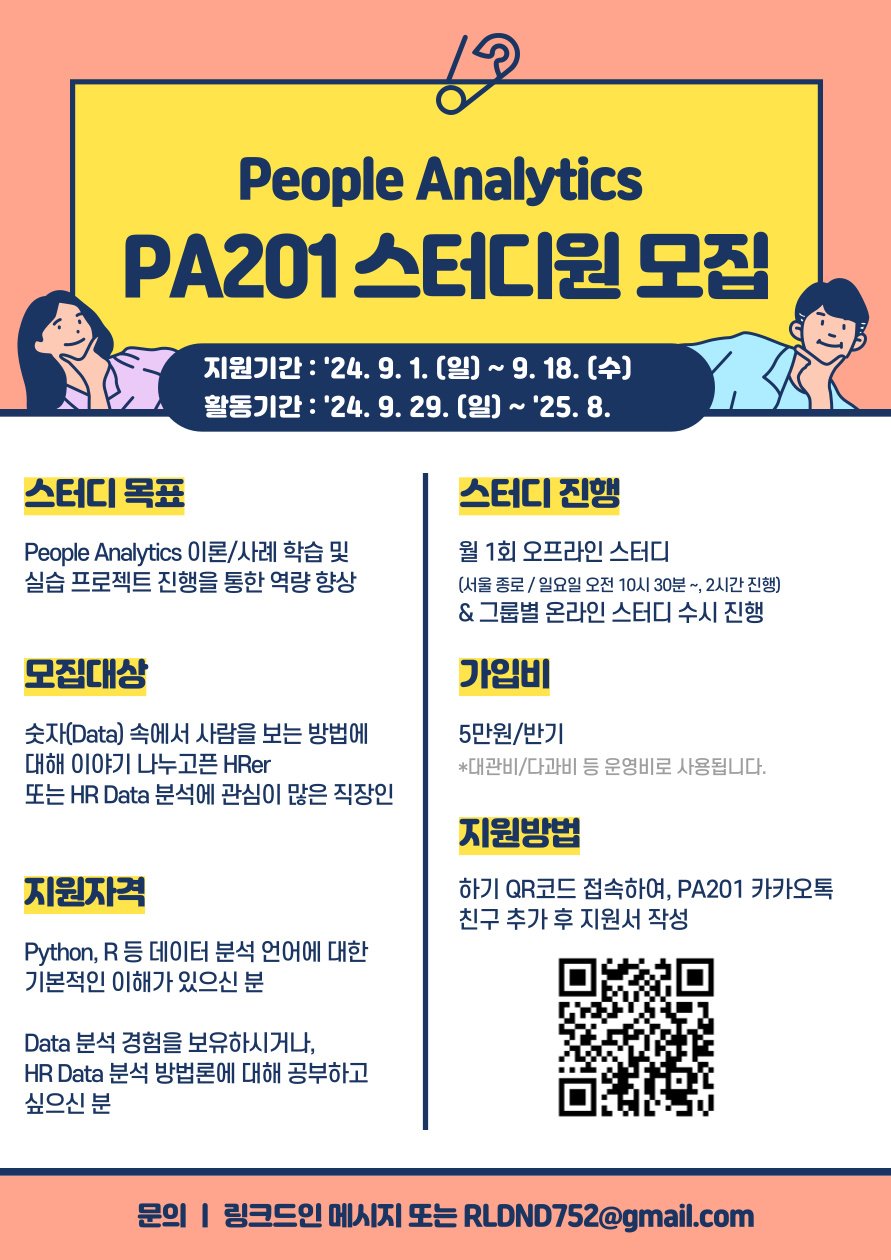 이에 앞으로 피플애널리틱스 스터디를 함께할 스터디원을 모집하오니 많은 관심 부탁드립니다.