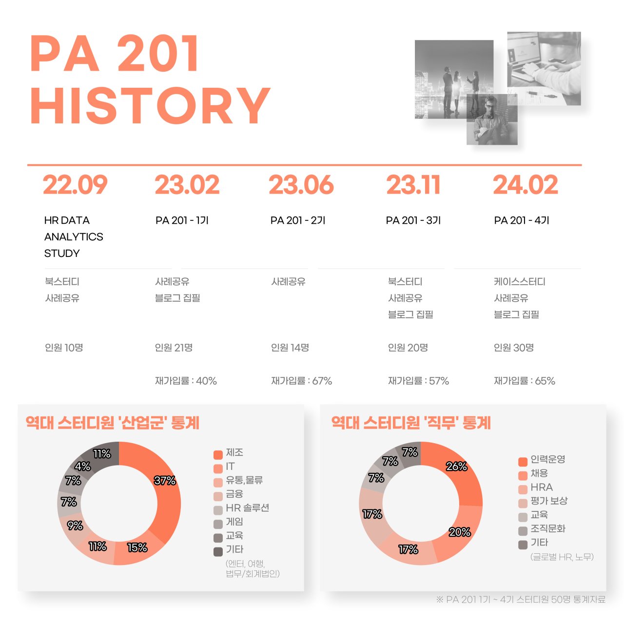 왜 201인가요? : 일반적으로 대학교에서 위한 1학년 수업이 100번대 코드를 갖습니다. 따라서 101 코드는 가장 초심자를 위한 수업이라는 의미입니다. 따라서 PA201은 HR 및 데이터 분석에 대해 아무것도 모르는 초심자(1학년)를 위한 스터디가 아닙니다. 저희는 HR, 통계, 머신러닝에 대해 생초보는 아니지만, 계속 배움에 갈증을 느끼거나 함께 공부하고 노하우를 공유하고 싶은 사람들의 모임입니다.