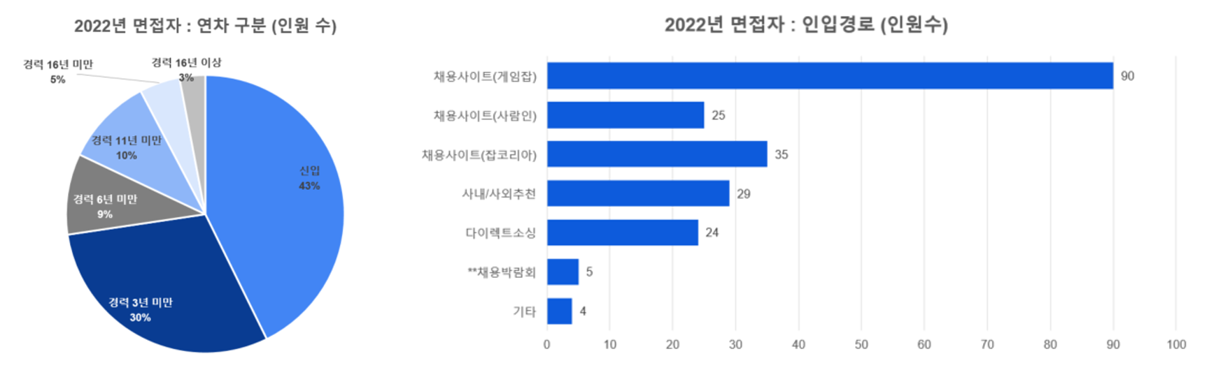 데이터 수집 시 범주로 구분되는 항목은 가급적 동일명칭을 표기하는 것이 나으나, 연속 변수는 이후 전처리 과정을 거치더라도 Raw data에는 정보를 많이 포함하고 있는 편이 좋다고 생각하여 상세 기입하는 편입니다. (ex. 경력기간 3년 4개월 (O) / 경력기간 3년 이상 ~ 6년 미만 (X)) 실제로 회사에서 2022년에 진행한 채용 건을 분석하여 아래와 같이 시각화 해보았습니다. (값 일부 수정)