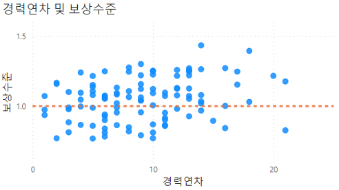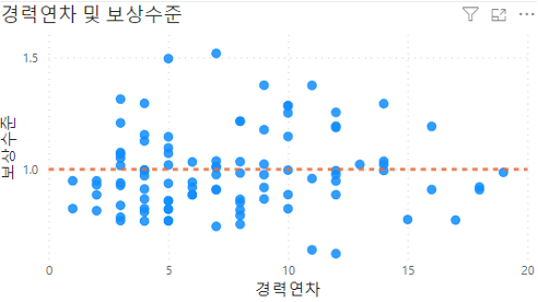 - 맨 왼쪽 아래의 데이터는 보상수준-경력연차를 분산형 차트로 나타낸 것으로, 보상수준 산출 방식에 따라 경력연차와 함께 보면 시너지가 날 것 같다는 판단으로, 경력연차와 보상수준을 동시에 볼 수 있도록 했다.