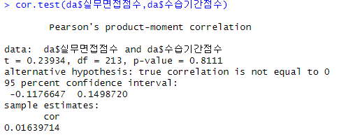 - 대립가설: 면접점수와 수습기간 평가점수 간 서로 차이가 있다.
