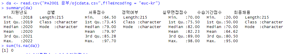 성별, 경력여부는 문자이기에 요약 값이 나오지 않았으며, 결측 값 여부 검증 결과 데이터에는 문제가 없기에 분석을 진행하였다.
