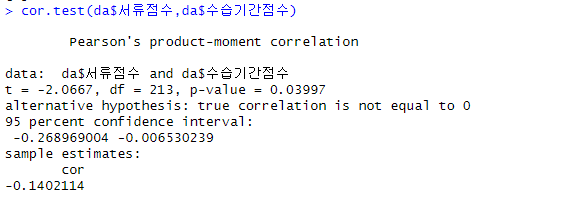 - 대립가설: 면접점수와 수습기간 평가점수 간 서로 차이가 있다.